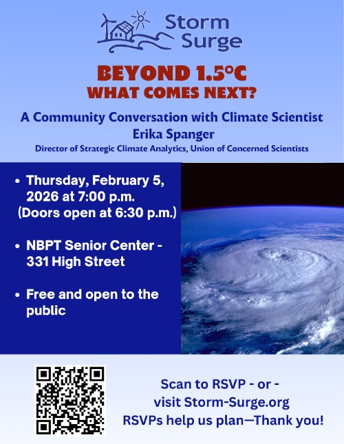 Summary: Join us as climate scientist Erika Spanger of the Union of Concerned Scientists helps our community make sense of this pivotal moment. Erika will walk us through the latest science, explore what increased warming means for sea level rise and extreme weather in coastal communities like ours. Date: Thursday, February 5, 2026 Time: Doors open 6:30 p.m. | Program begins 7:00 p.m. Location: Newburyport Senior Community Center